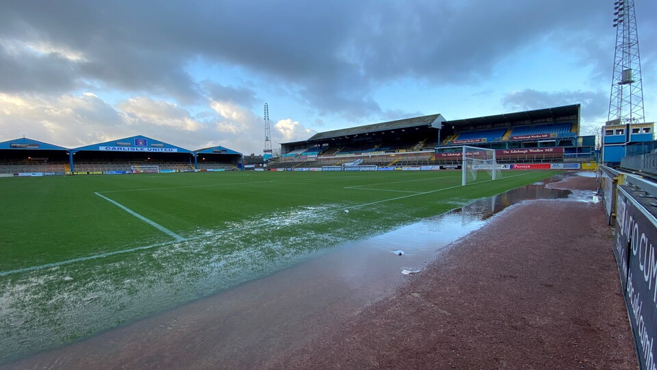 The Waterworks End at Brunton Park has the usual standing water following Storm Ciara, but it has already receded and Dave Mitchell is preparing the pitch as normal ahead of tomorrow's game against Cheltenham Town.
