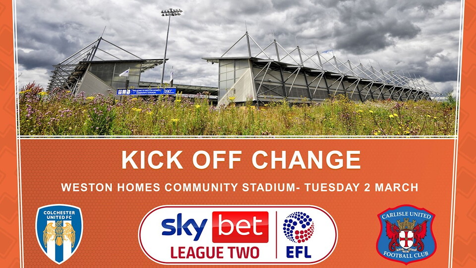 Colchester United v Carlisle United, Tuesday 2 March, kick off 7pm